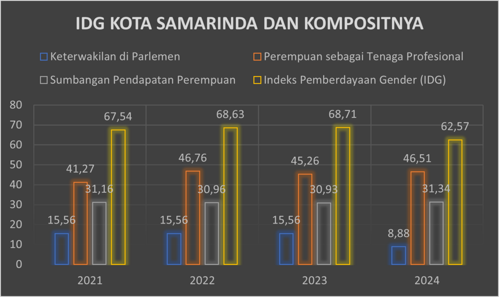 Indeks Pemberdayaan Gender (IDG) Kota Samarinda menunjukkan tren cukup stabil pada periode 2021–2023 dengan nilai sekitar 67–69, namun mengalami penurunan pada tahun 2024 menjadi 62,57. Komponen yang paling berkontribusi adalah perempuan sebagai tenaga profesional yang terus meningkat dari 41,27% pada 2021 menjadi 46,51% pada 2024. Sementara itu, sumbangan pendapatan perempuan relatif stagnan di kisaran 30–31%. Di sisi lain, keterwakilan perempuan di parlemen tetap rendah, bahkan turun signifikan dari 15,56% (2021–2023) menjadi hanya 8,88% pada 2024. Kondisi ini turut memengaruhi penurunan nilai IDG di tahun terakhir.
