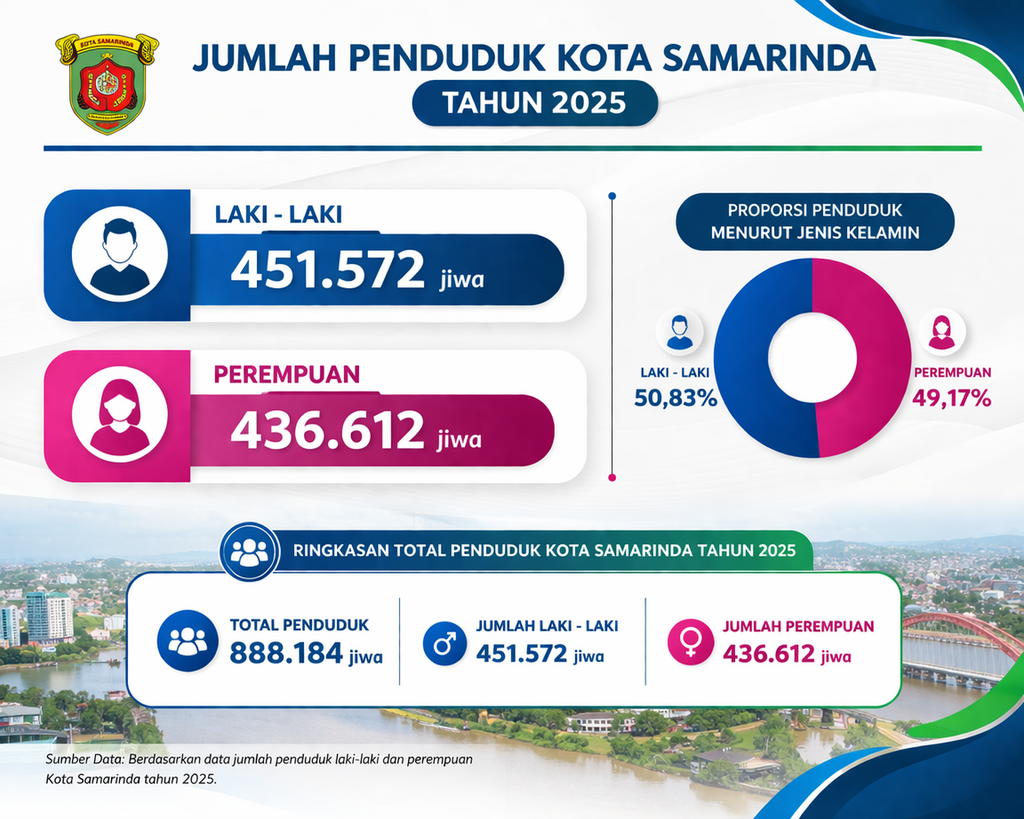 Jumlah penduduk Kota Samarinda Tahun 2025 tercatat sebanyak 888.184 jiwa, yang terdiri dari 451.572 jiwa penduduk laki-laki dan 436.612 jiwa penduduk perempuan. Komposisi ini menunjukkan bahwa jumlah penduduk laki-laki sedikit lebih tinggi dibandingkan perempuan, namun secara umum masih dalam kondisi yang relatif seimbang.